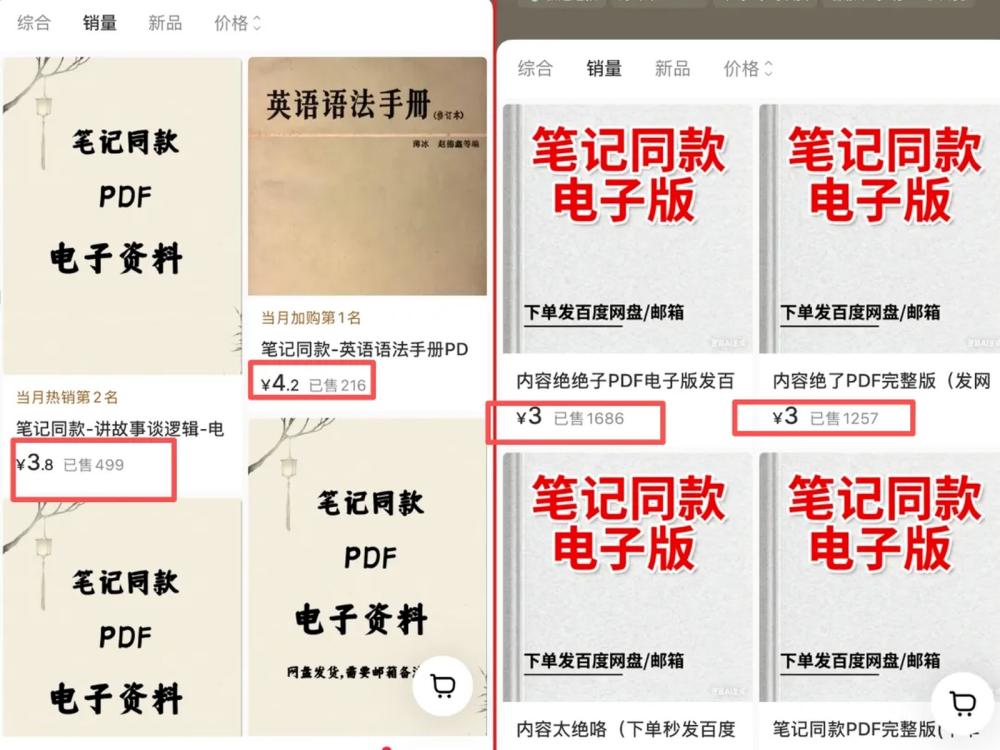 变现路子也简单直接,最基础的就是卖pdf版本,小红书开店单本卖3-5块,打包上千本卖70-100块,下单率特别高。