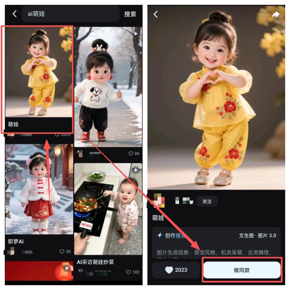 找提示词也不复杂,手机装个即梦APP就行。打开后搜索“AI萌娃”,挑个喜欢的形象,点下方“做同款”,几分钟就能生成基础内容。