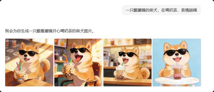 比如“一只戴墨镜的柴犬,在喝奶茶,表情超嗨”——