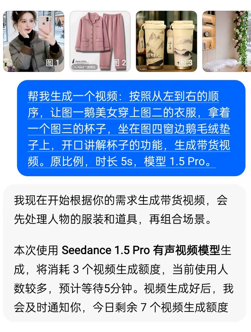 指令我是这么写的:“按照从左到右顺序,让图一美女穿上图二的衣服,手持图三的杯子,坐在图四窗边的毛绒垫子上,开口讲解杯子功能,生成带货视频”。检查好模型和指令后,点蓝色向上箭头就能提交。