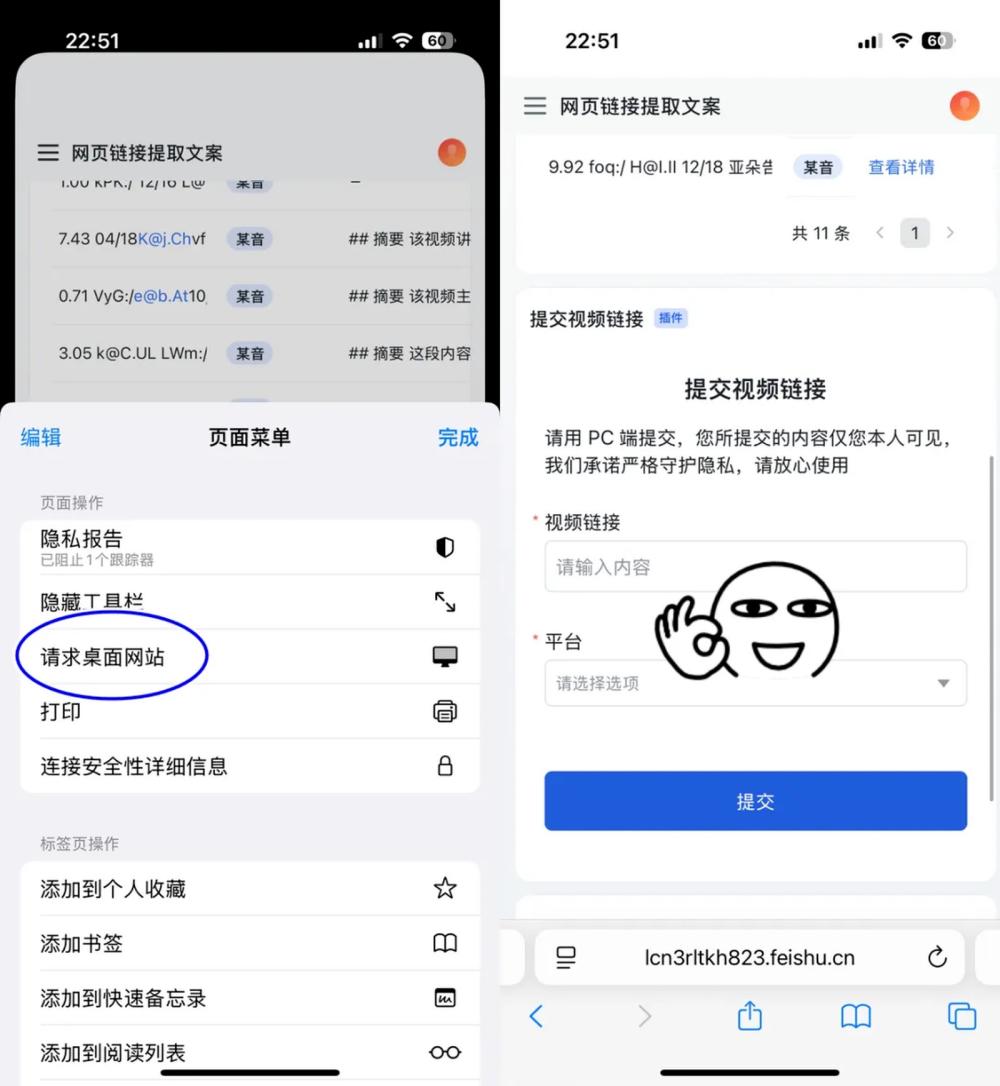 登录后,从抖音、小红书、快手、B站等平台复制视频分享链接,直接粘贴到网页左下角,选择对应的视频平台提交即可。它能自动识别分享文案里的链接,不用手动删除无关文字,提交后只有自己能看到,隐私性也有保障。