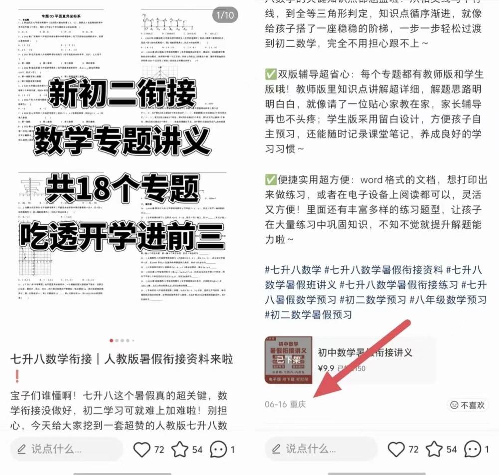 为什么选这个?因为家长的焦虑是无止境的,而且是可以被量化的。我在小红书上盯到了一个账号,这个博主做了8个月,只卖初中各科的复习讲义。