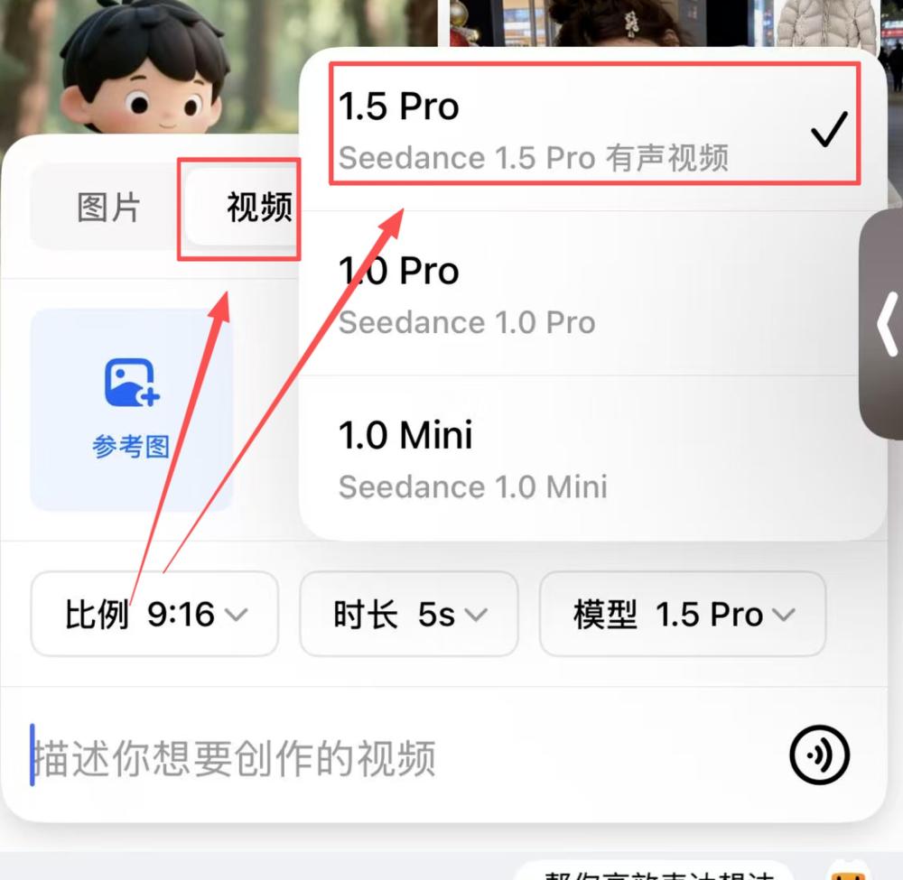 进入页面后默认是图片标签,记得切换到“视频”选项,模型直接选1.5pro,这步千万别错,不然生成的视频可能没声音。