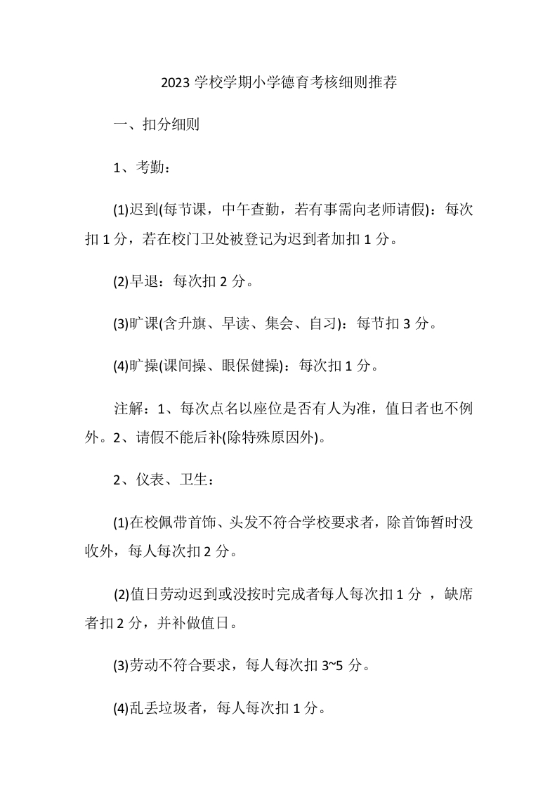 2023学校学期小学德育考核细则推荐范文
