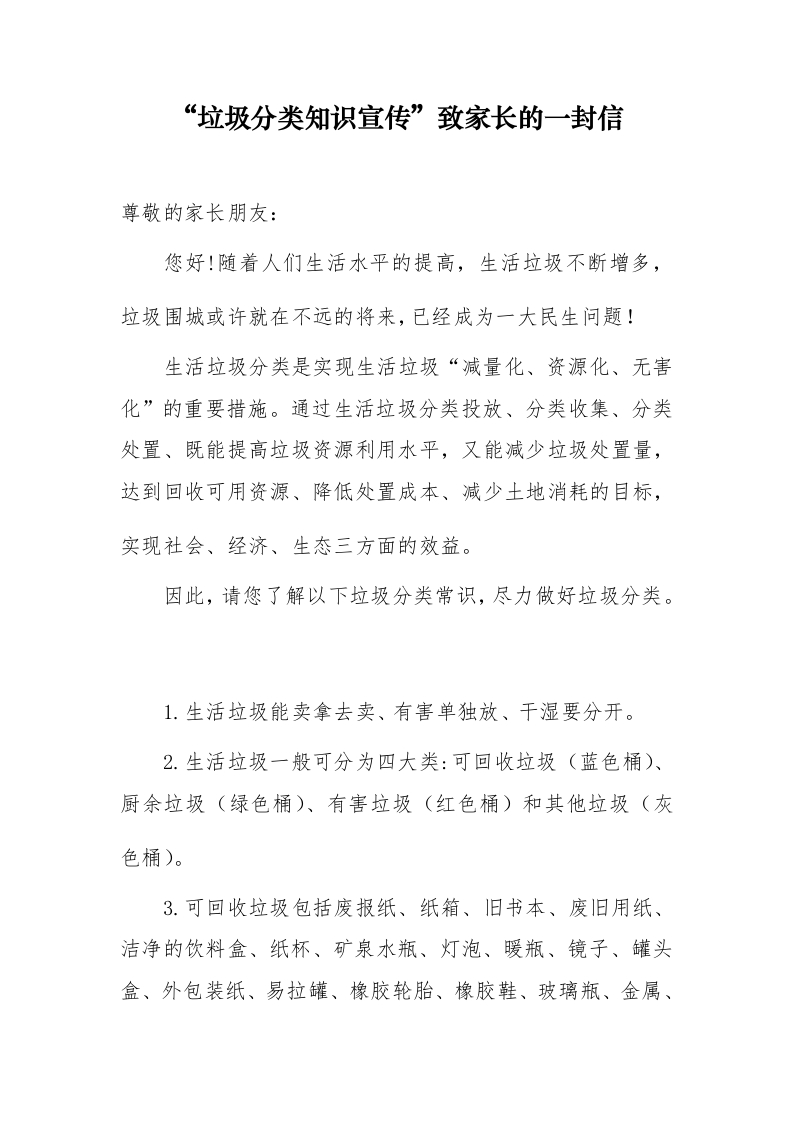 首页综合资料垃圾分类“垃圾分类知识宣传”致家长的一封信