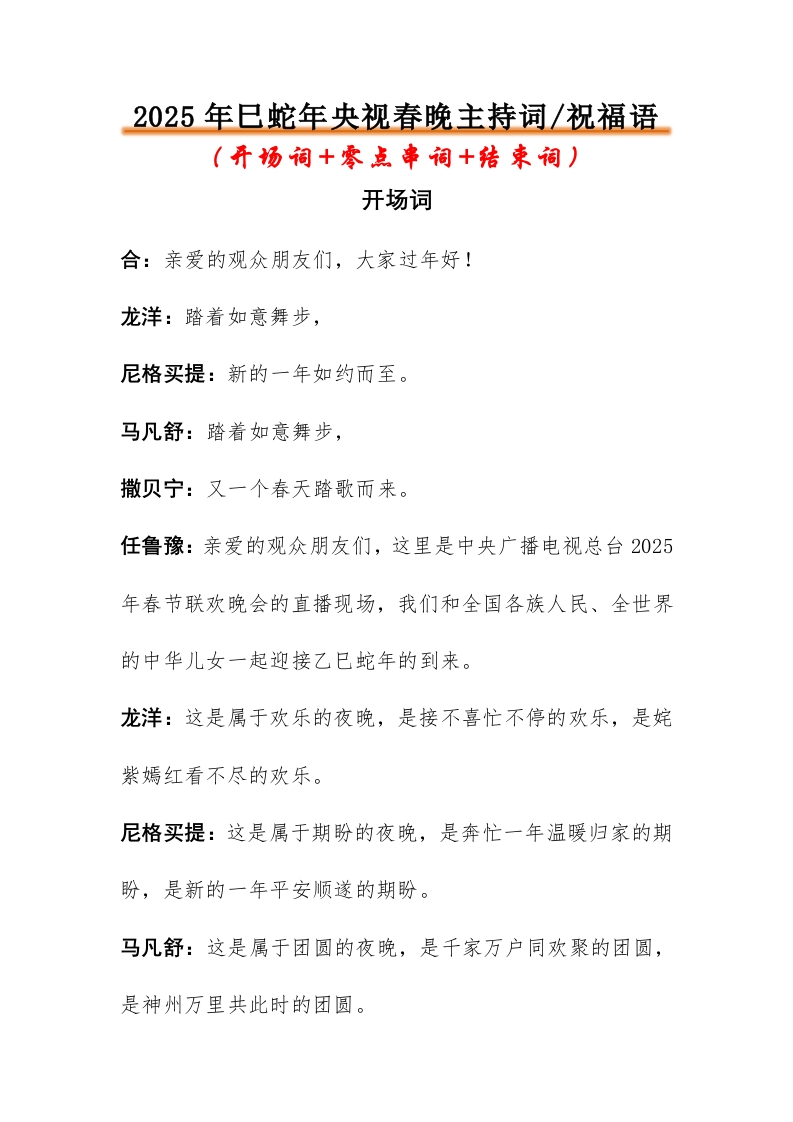 2025年蛇年央视春晚主持词祝福语