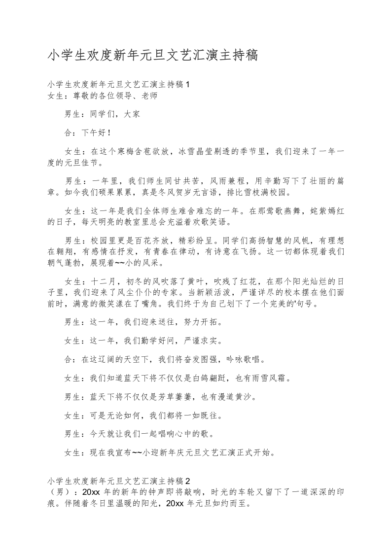 首页热门资源重要节日41、小学生欢度新年元旦文艺汇演主持稿--开场白2人主持稿
