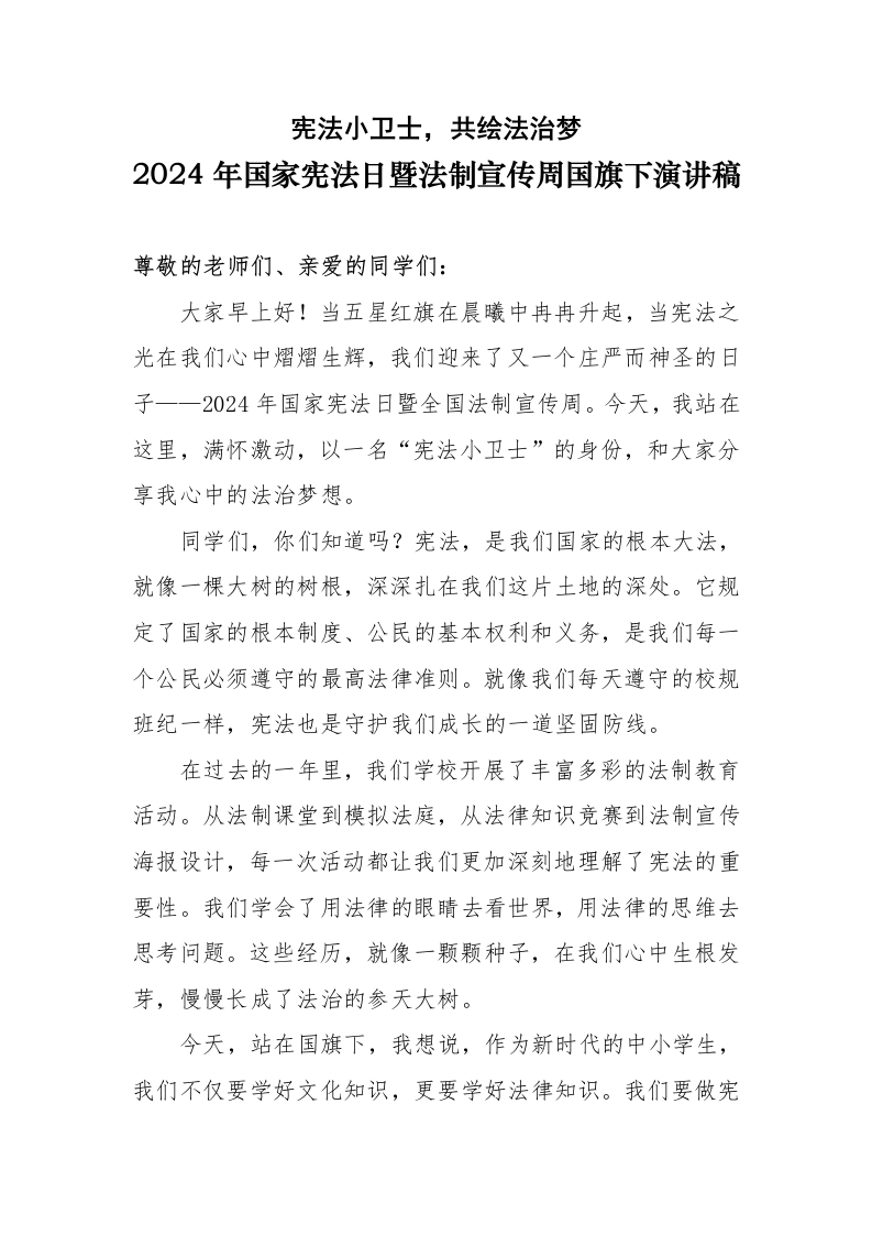 2024年国家宪法日暨法制宣传周学生国旗下演讲稿