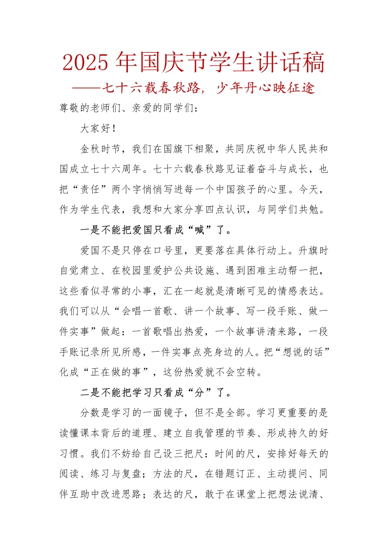 首页热门资源重要节日2025年国庆节学生讲话稿:七十六载春秋路,少年丹心映征途