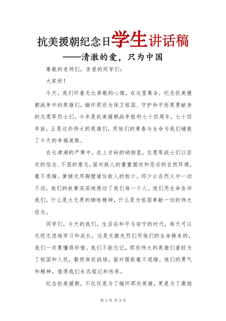 抗美援朝纪念日学生讲话稿