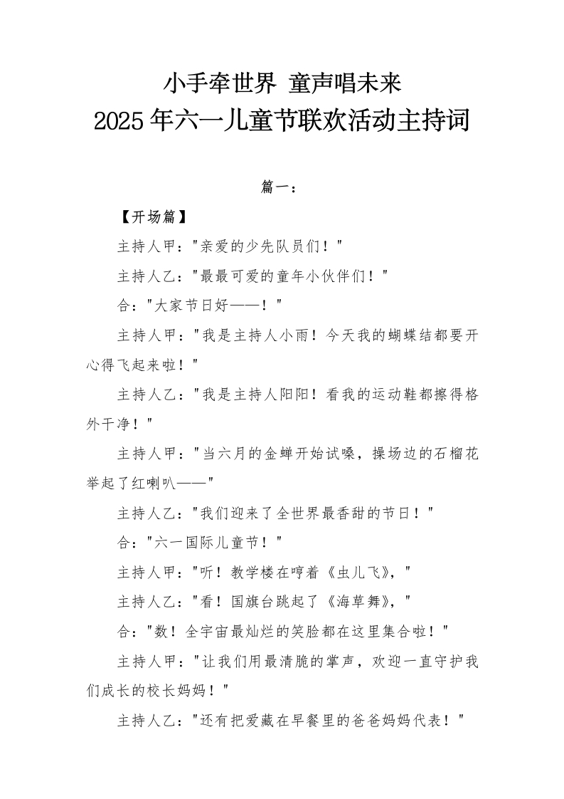 小手牵世界 童声唱未来——2025年六一儿童节联欢活动主持词
