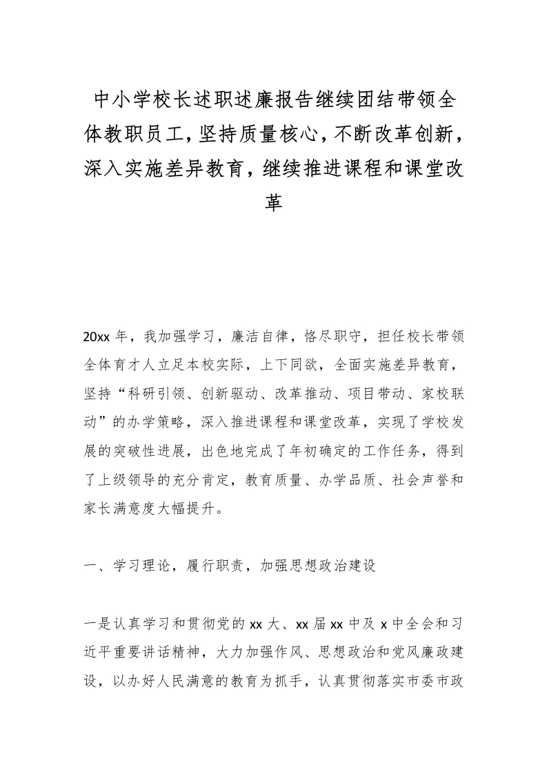 中小学校长述职述廉报告继续团结带领全体教职员工,坚持质量核心,不断改革创新,深入实施差异教育,继续推进课程和课堂改革