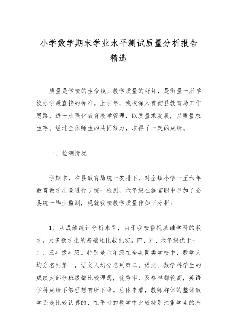 首页教师资料 经验汇报小学数学期末学业水平测试质量分析报告精选