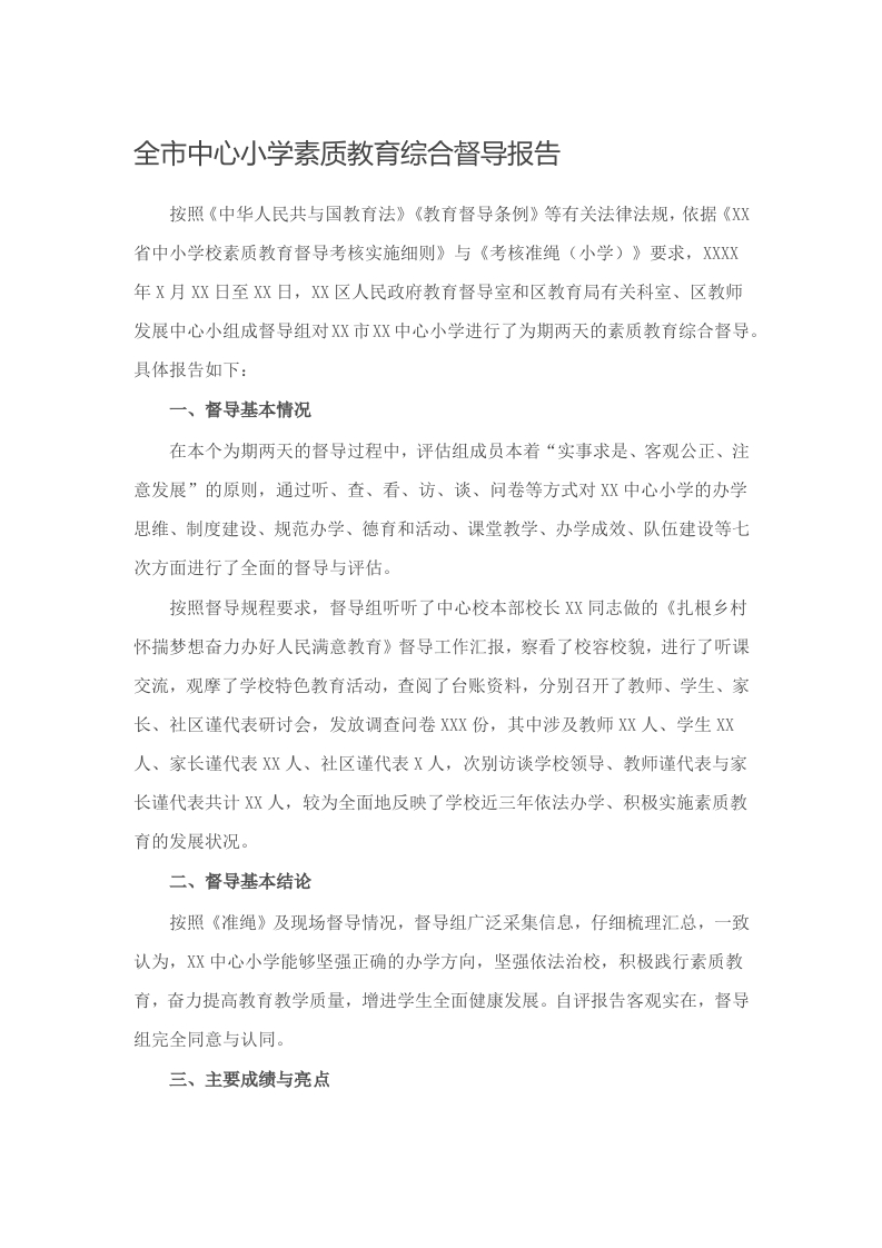 全市中心小学素质教育综 合督导报告