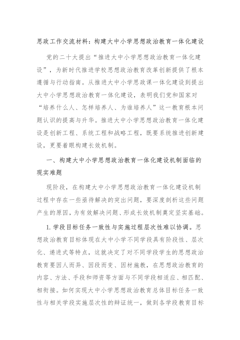思政工作交流材料:构建大中小学思想政治教育一体化建设