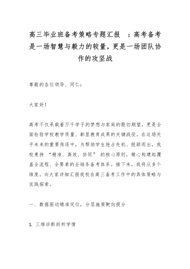 首页教师资料 经验汇报高三毕业班备考策略专题汇报​:高考备考是一场智慧与毅力的较量,更是一场团队协作的攻坚战