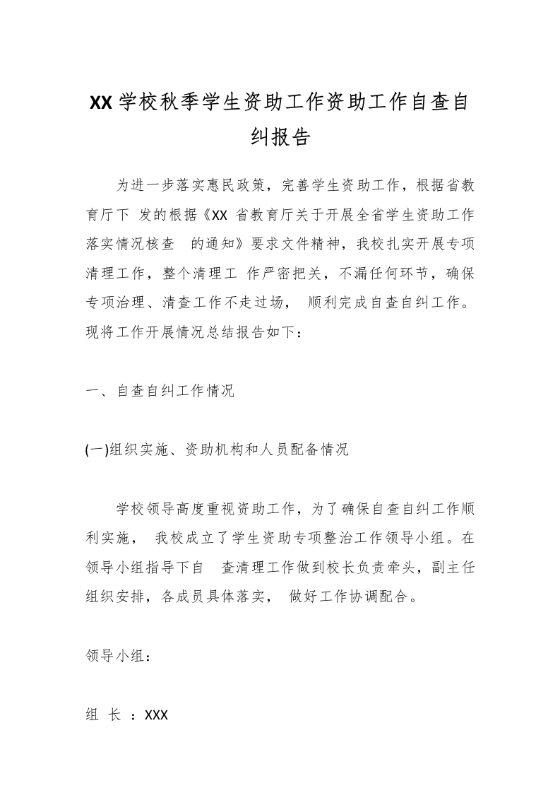 首页教师资料 经验汇报XX学校秋季学生资助工作资助工作自查自纠报告