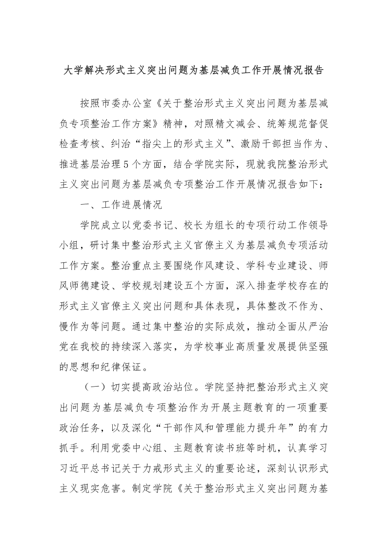 大学解决形式主义突出问题为基层减负工作开展情况报告