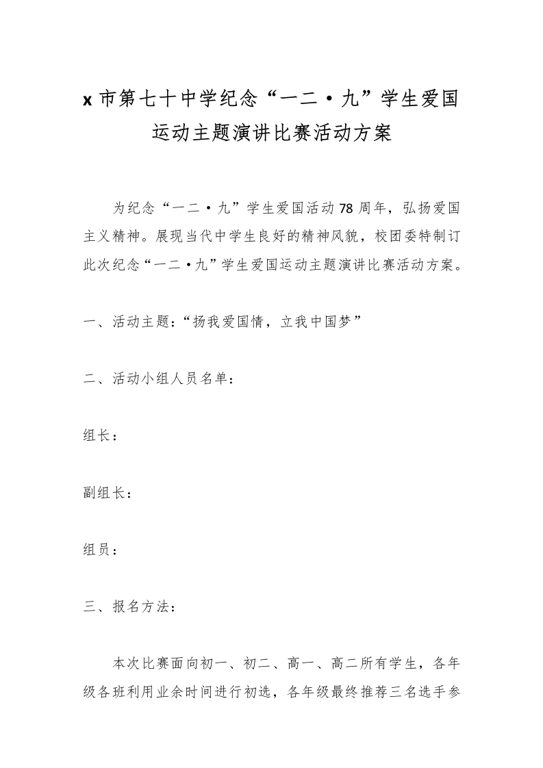 x市第七十中学纪念“一二·九”学生爱国运动主题演讲比赛活动方案