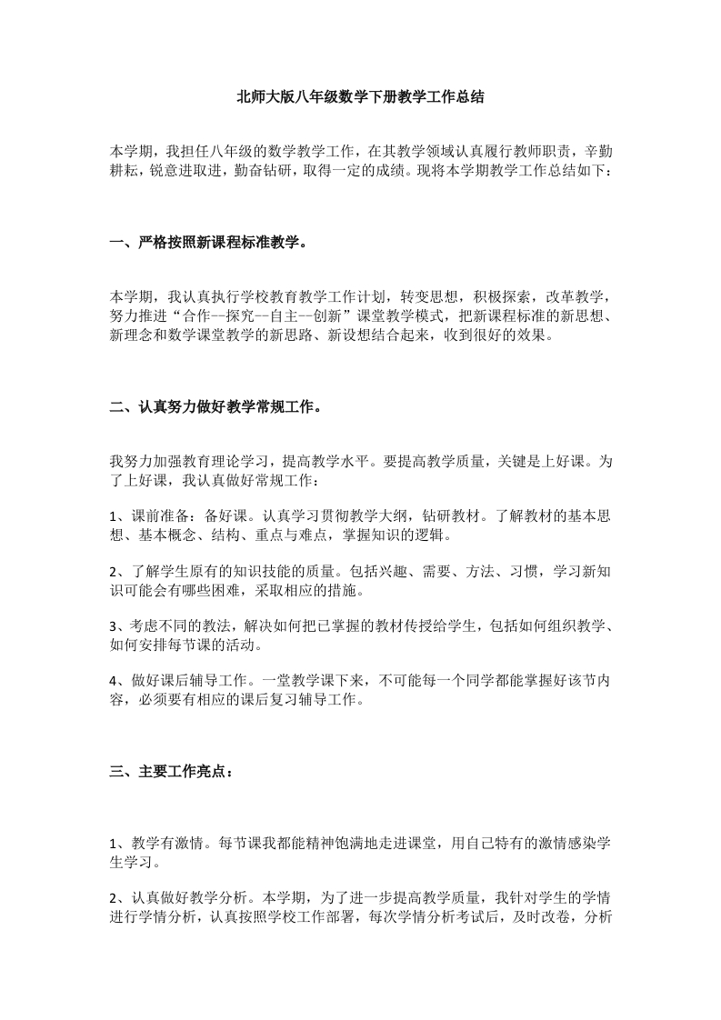 北师大版八年级数学下册教学工作总结