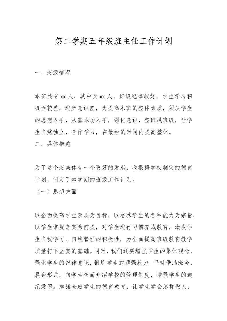 首页教师资料 计划总结第二学期五年级班主任工作计划