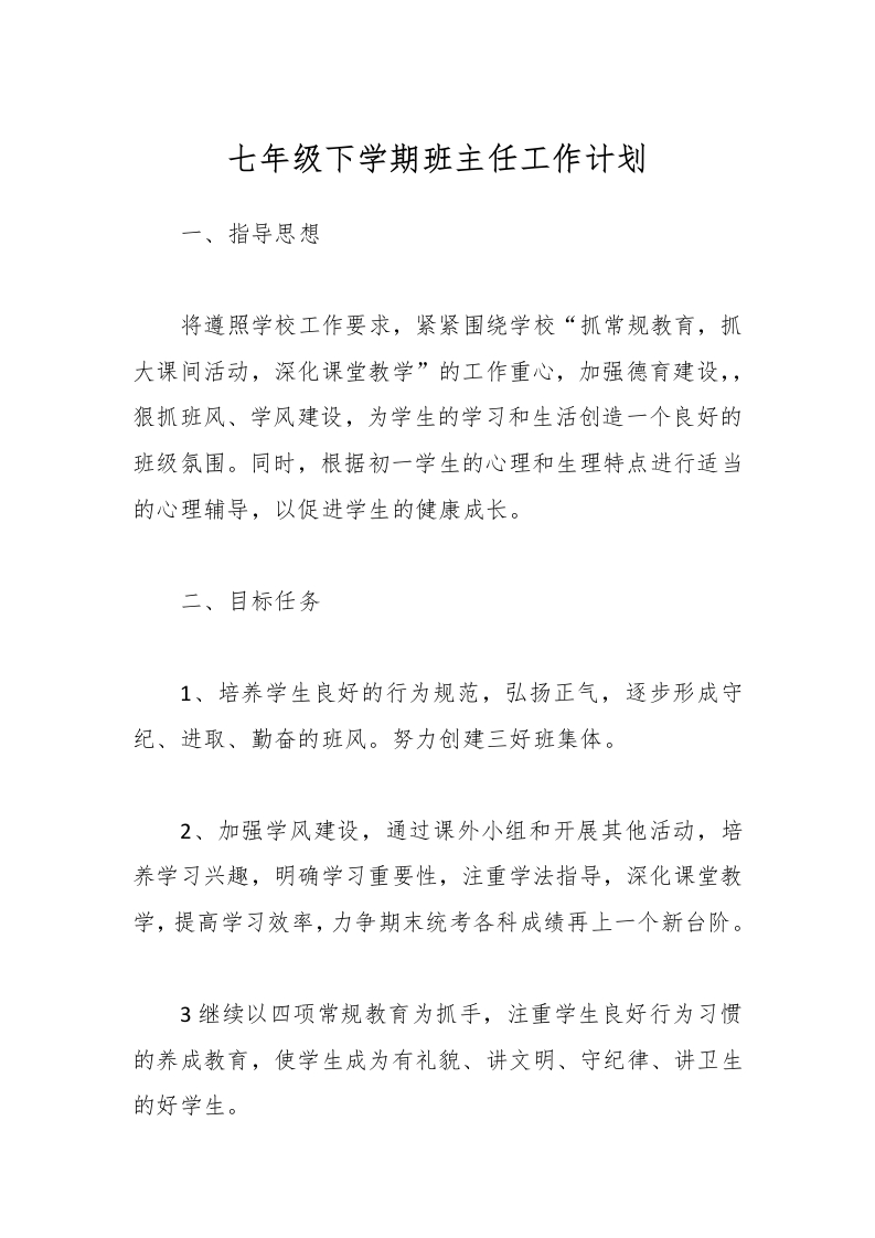 七年级下学期班主任工作计划
