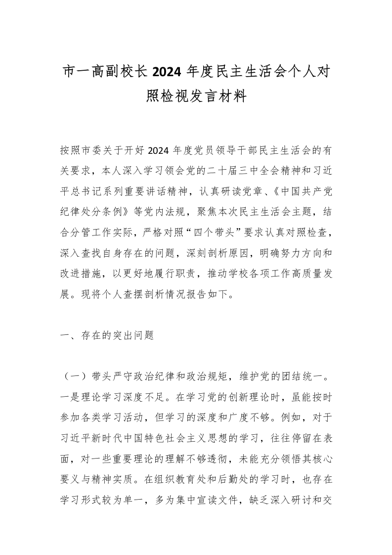 首页校长资料报告总结市一高副校长2024年度民主生活会个人对照检视发言材料