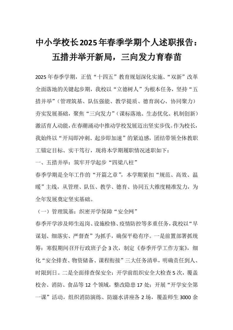 中小学校长2025年春季学期个人述职报告:五措并举开新局,三向发力育春苗