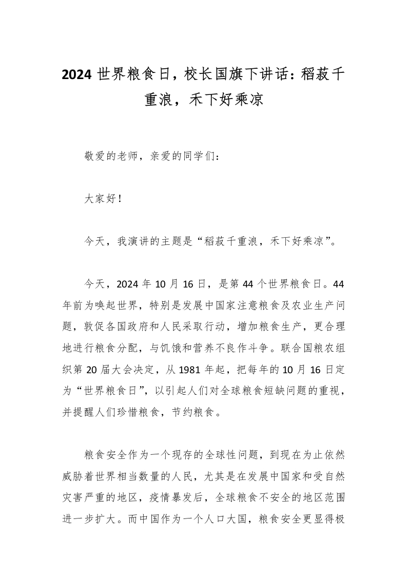 2024世界粮食日,校长国旗下讲话:稻菽千重浪,禾下好乘凉