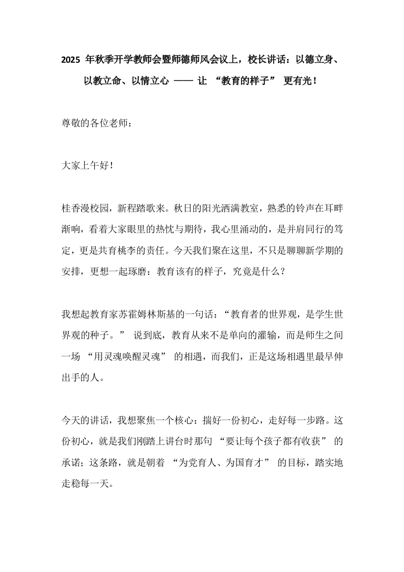 2025 年秋季开学教师会暨师德师风会议上,校长讲话:以德立身、以教立命、以情立心 —— 让 “教育的样子” 更有光!