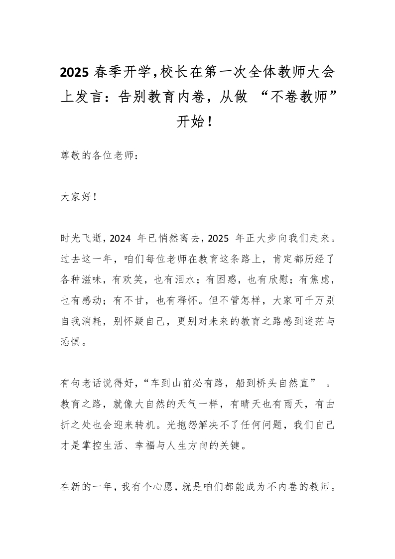 2025春季开学,校长在第一次全体教师大会上发言:告别教育内卷,从做 “不卷教师” 开始!