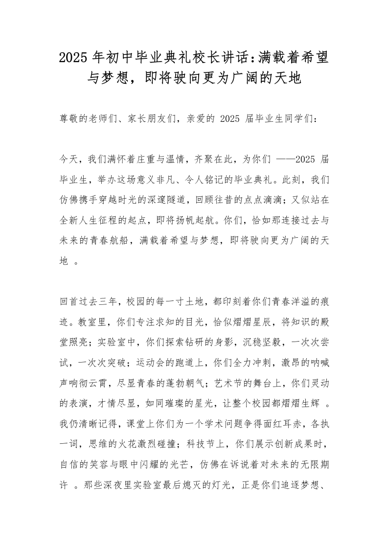 2025年初中毕业典礼校长讲话:满载着希望与梦想,即将驶向更为广阔的天地