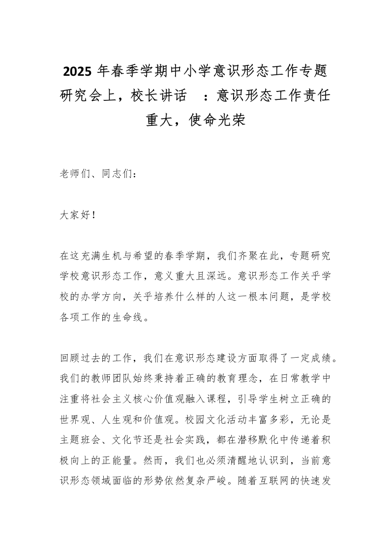 2025年春季学期中小学意识形态工作专题研究会上,校长讲话​:意识形态工作责任重大,使命光荣