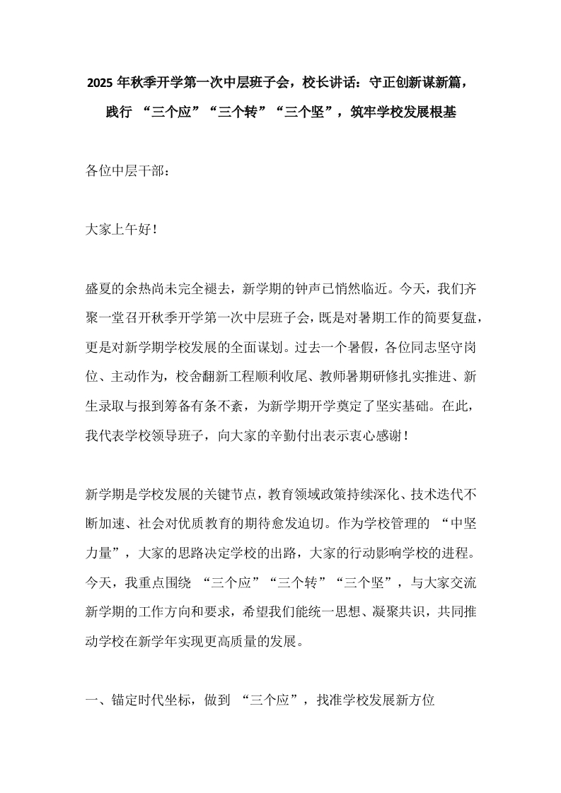 2025年秋季开学第一次中层班子会,校长讲话:守正创新谋新篇,践行 “三个应”“三个转”“三个坚”,筑牢学校发展根基