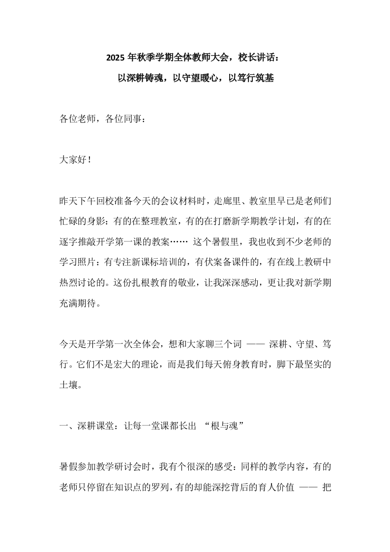 2025年秋季学期全体教师大会,校长讲话:以深耕铸魂,以守望暖心,以笃行筑基