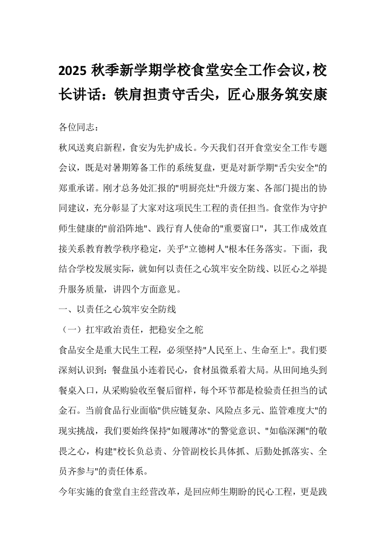 2025秋季新学期学校食堂安全工作会议,校长讲话:铁肩担责守舌尖,匠心服务筑安康