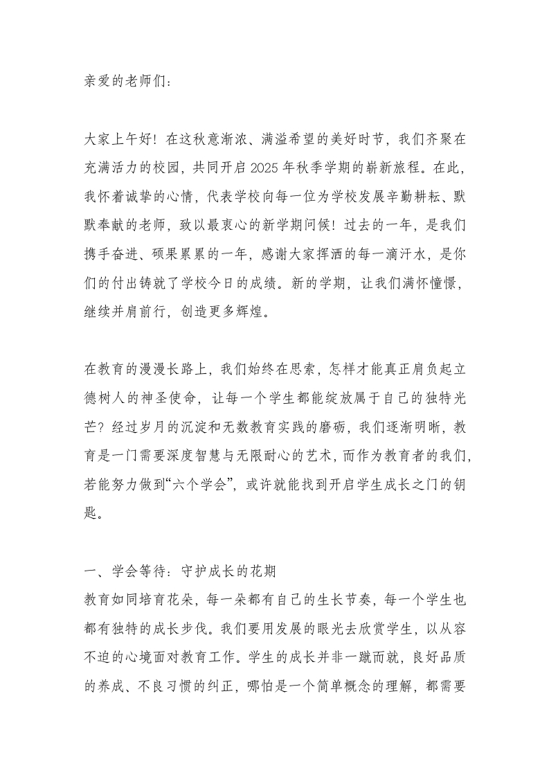 2025秋季开学第一次全体教师大会讲话:如何践行“六个学会”?共绘教育新蓝图!
