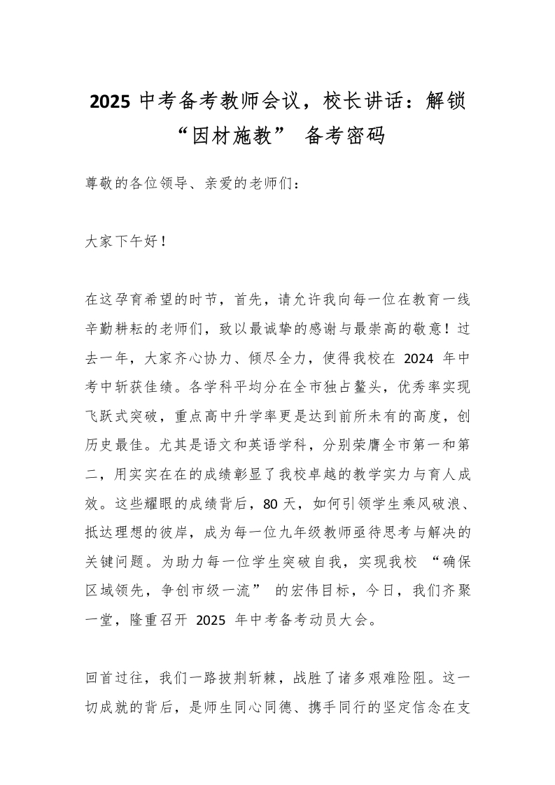 首页校长资料工作讲话2025中考备考教师会议,校长讲话:解锁 “因材施教” 备考密码
