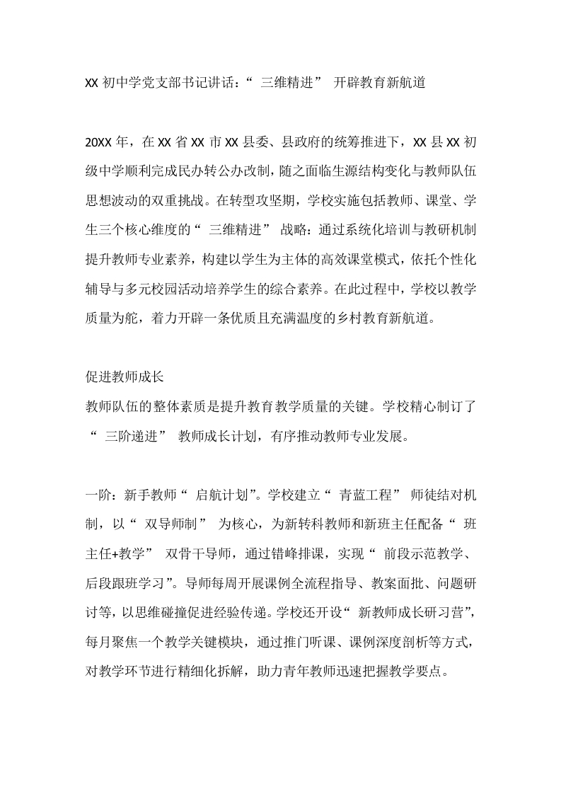 XX初中学党支部书记讲话:“ 三维精进” 开辟教育新航道