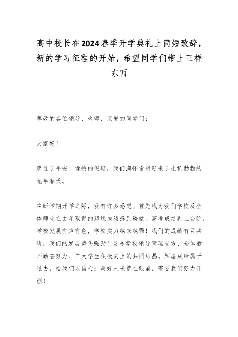 高中校长在2024春季开学典礼上简短致辞,新的学习征程的开始,希望同学们带上三样东西