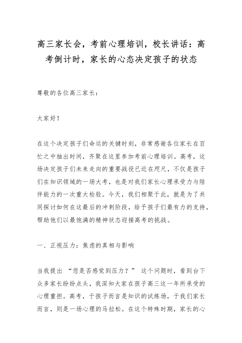 首页校长资料工作讲话高三家长会,考前心理培训,校长讲话:高考倒计时,家长的心态决定孩子的状态