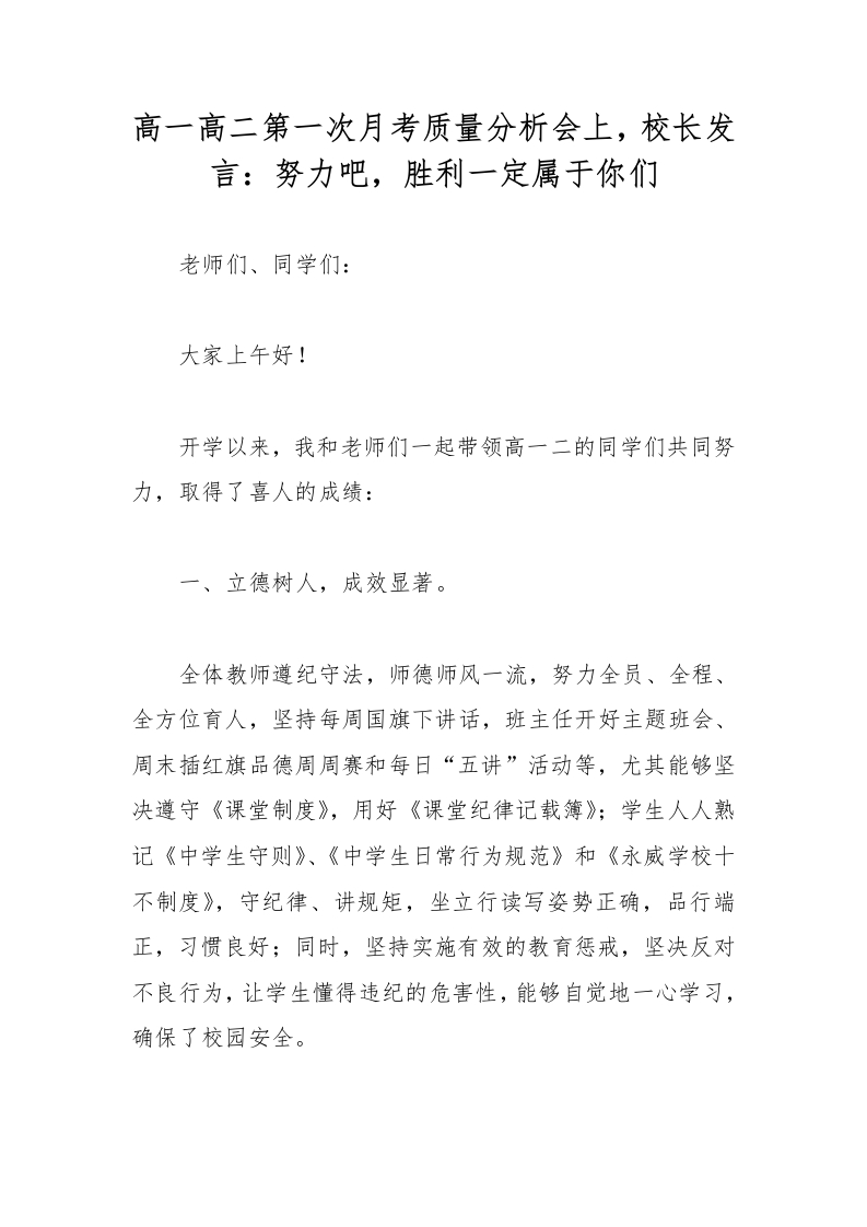高一高二第一次月考质量分析会上,校长发言:努力吧,胜利一定属于你们
