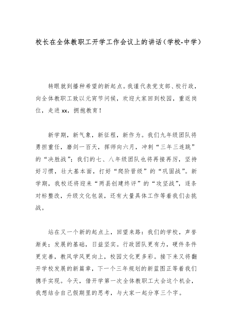 校长在全体教职工开学工作会议上的讲话(学校-中学)