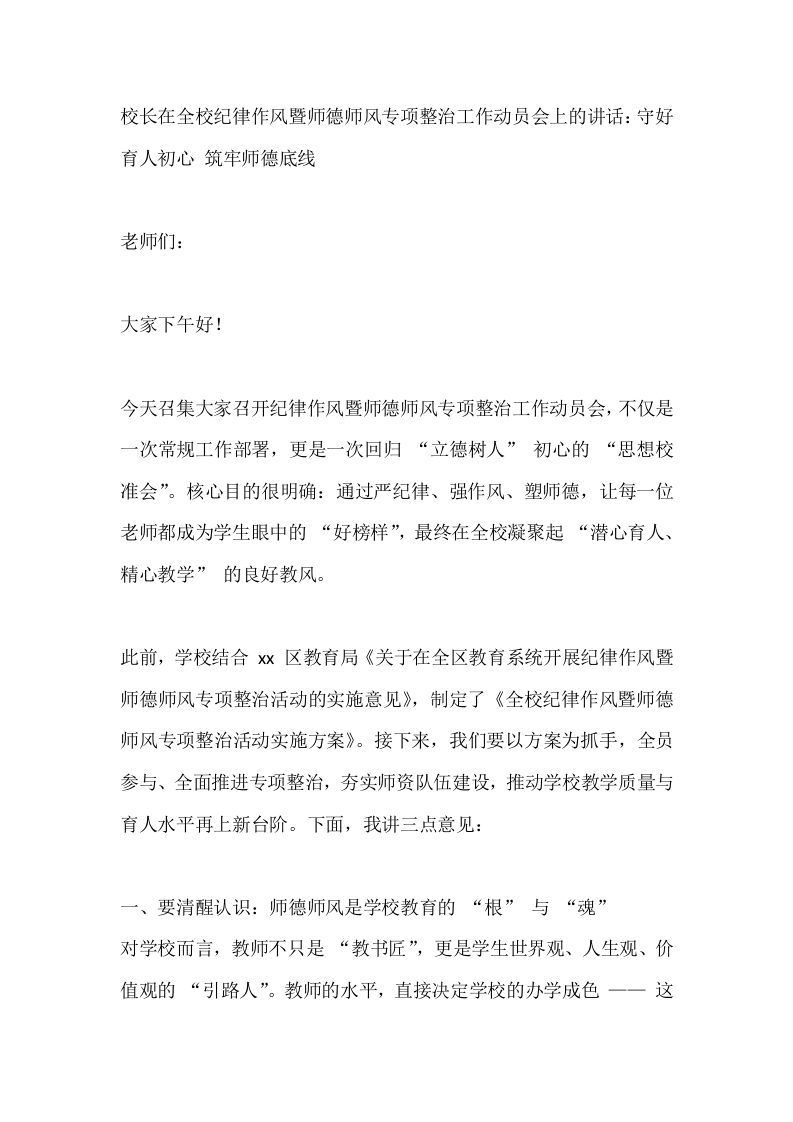 校长在全校纪律作风暨师德师风专项整治工作动员会上的讲话:守好育人初心 筑牢师德底线