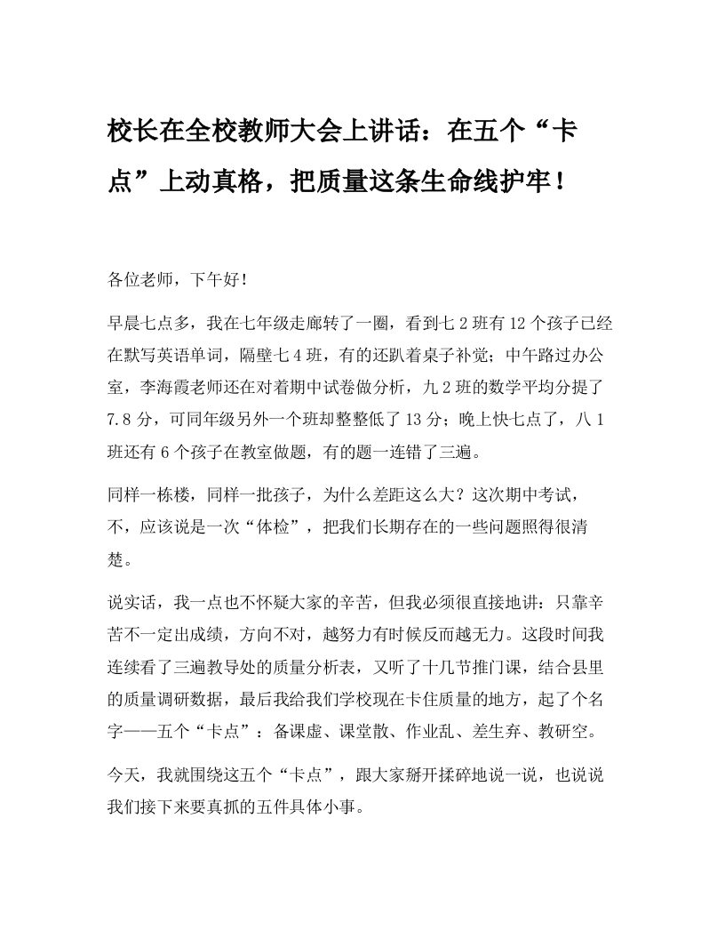 校长在全校教师大会上讲话:在五个“卡点”上动真格,把质量这条生命线护牢!