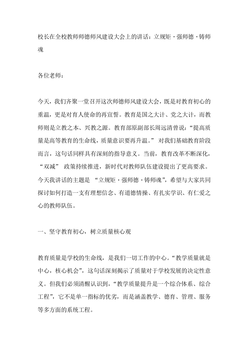 校长在全校教师师德师风建设大会上的讲话:立规矩・强师德・铸师魂
