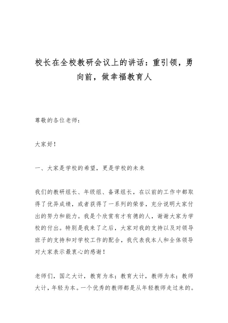 校长在全校教研会议上的讲话:重引领,勇向前,做幸福教育人