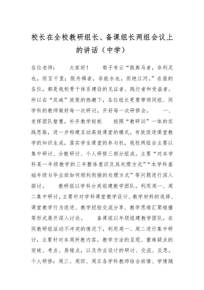 首页校长资料工作讲话校长在全校教研组长、备课组长两组会议上的讲话(中学)