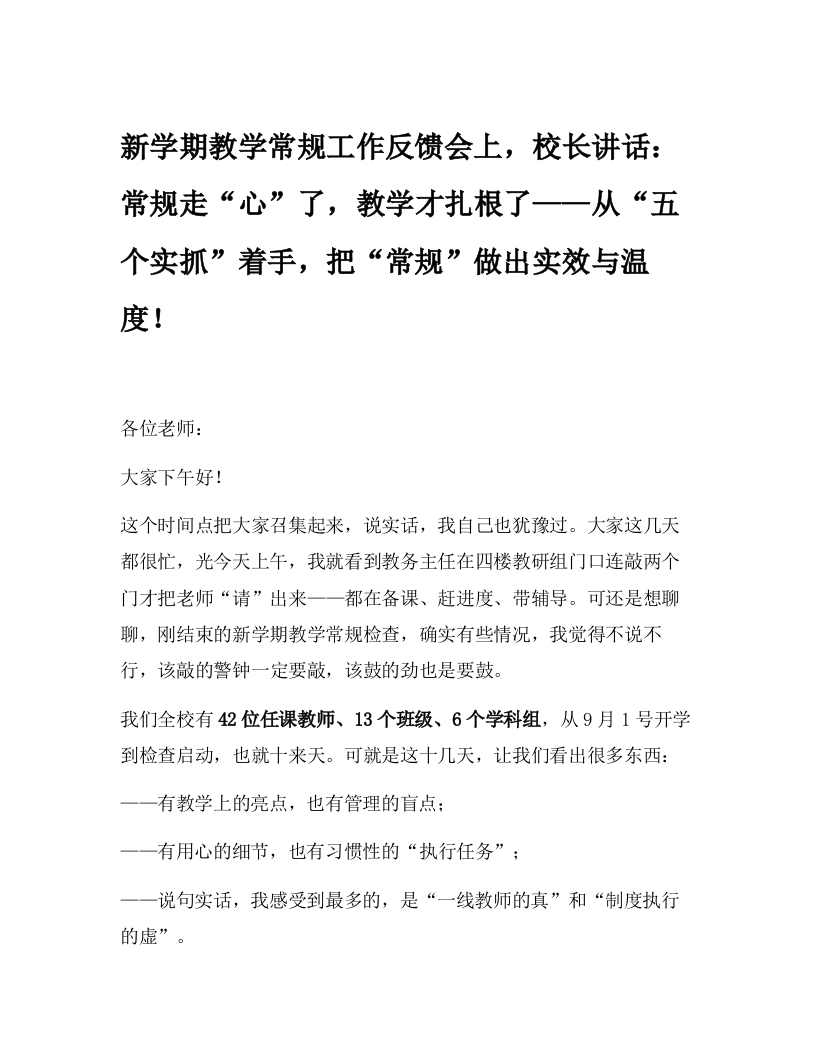 新学期教学常规工作反馈会上,校长讲话: 常规走“心”了,教学才扎根了——从“五个实抓”着手,把“常规”做出实效与温度!