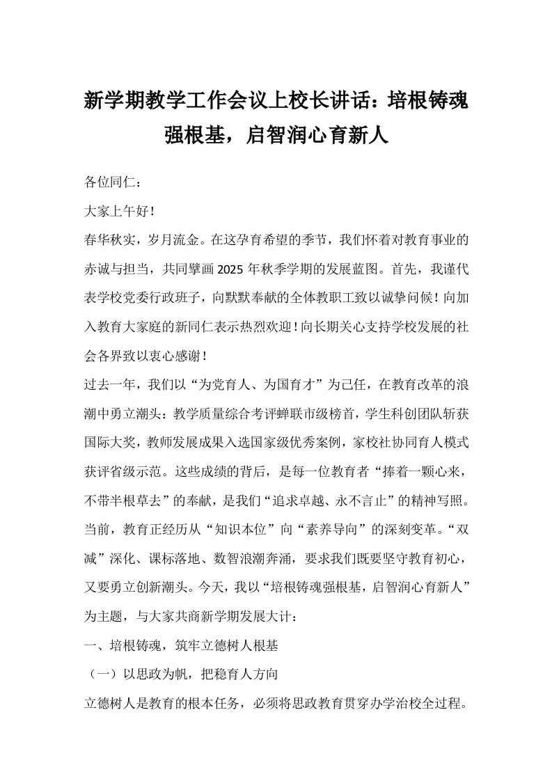 新学期教学工作会议上校长讲话:培根铸魂强根基,启智润心育新人